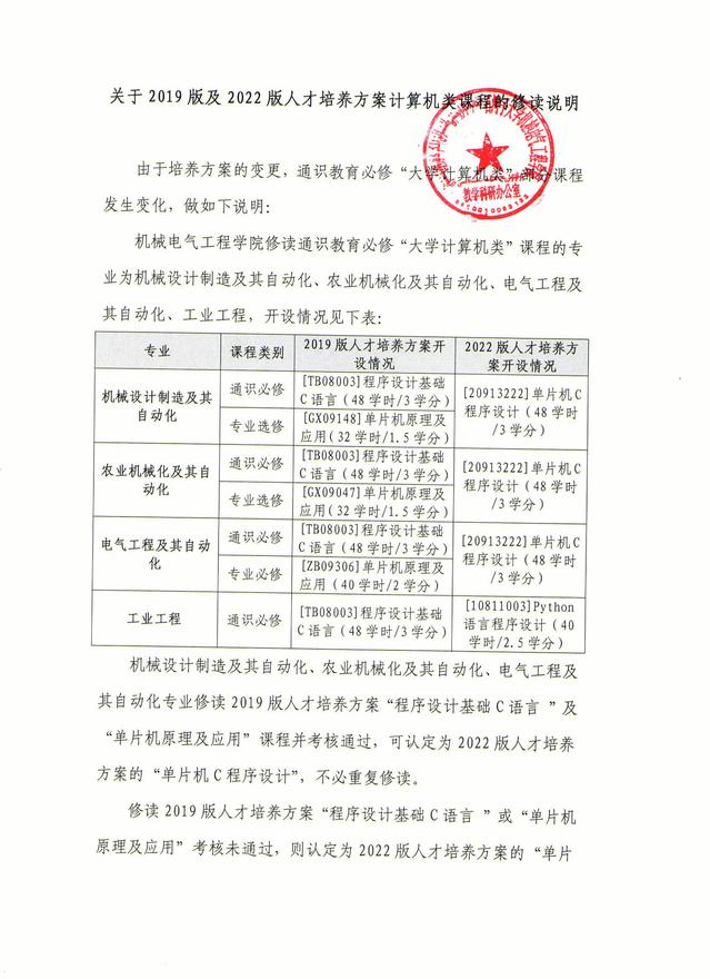关于2019版及2022版人才培养方案计算机类课程的修读说明